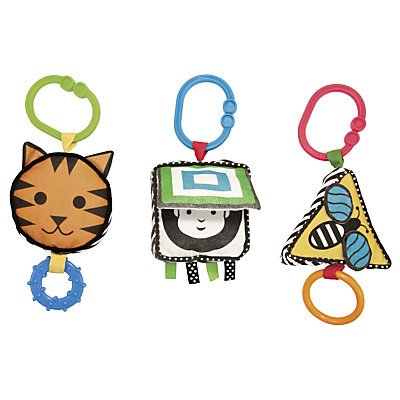 - This toy includes 3 separate shapes that clip on individually to most strollers and carriers